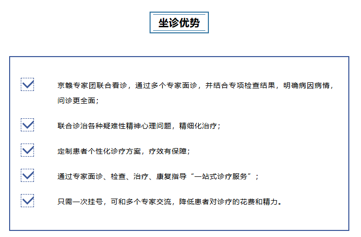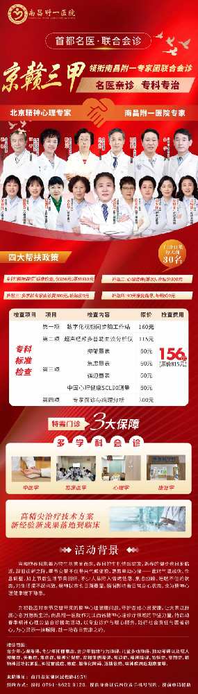 一、会诊内容1、京赣资深精神心理专家联合会诊,北京精神卫生中心武香芝教授带队会诊,中医学+临床医学+心理学+康复学等多学科会诊2、高精尖治疗技术方案新经验新成果落地到临床,让普通百姓获得医改红利;3、院内四大补贴援助:补贴一:首次心理咨询补贴后300元,原价580元补贴二:专科“精神四项”标准补贴后156元,原价815元补贴三:90天免费康复指导补贴四:多学科专家多对一会诊0元,原价300元2、会诊地点南昌市东湖区民德路495号3、会诊预约方式为了保证会诊日质量,我院将严格控制就诊人数。因此,会诊期间名额极为紧张,仅限30个预约名额~您可以通过以下途径进行咨询/挂号:1、点击下方“ 阅读原文 ”进行咨询;2、拨打咨询电话:0791-8622 9120